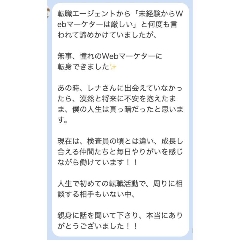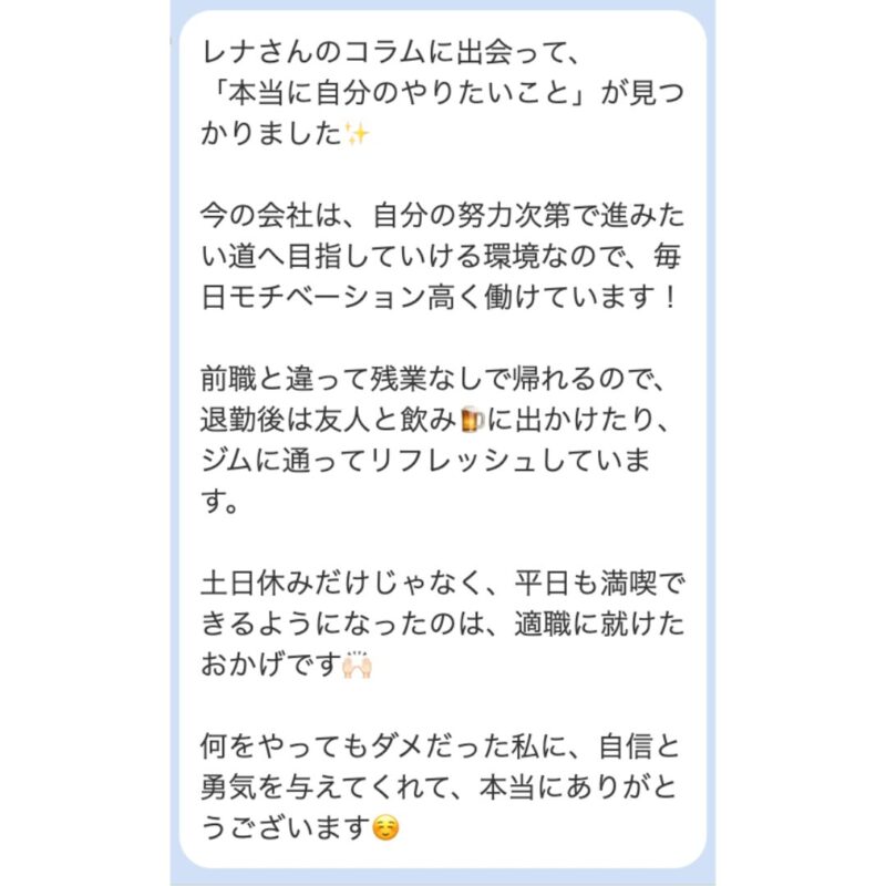 一応、これまでに1,080名以上の方をサポートした実績があって、無事に適職が見つかった読者さんからは、このような嬉しい声をいただいます!