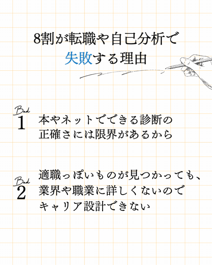 前回のコラムでは、多くの方が転職や本、診断などの自己分析で失敗する理由についてお伝えしました。