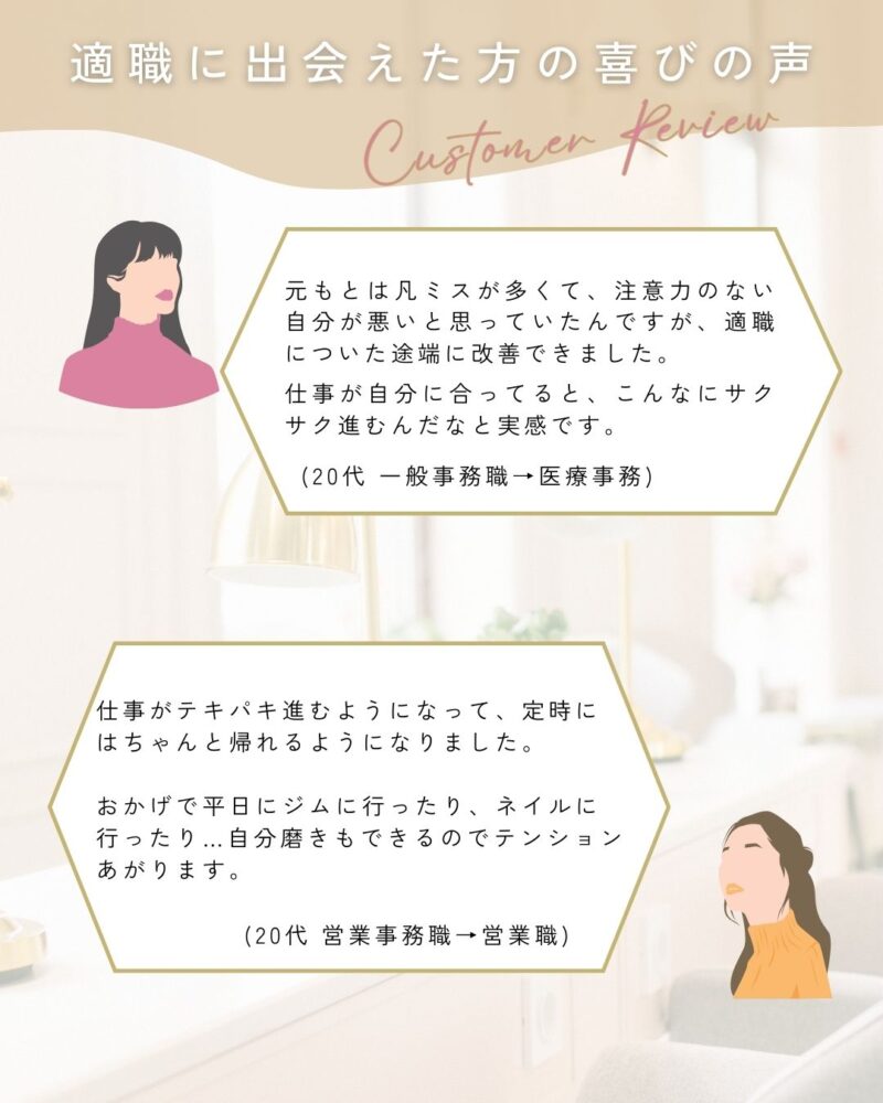 「適職につけたおかげで、仕事が終わらなくて残業する…みたいなことが一切なくなりました。おかげさまで平日でも友達と遊びに出られて最高です!」